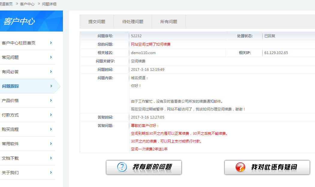 四、對原問題繼續(xù)提問:進(jìn)入客戶中心》問題跟蹤,查看問題,點(diǎn)擊“我對此還有疑問”(如圖所示:)