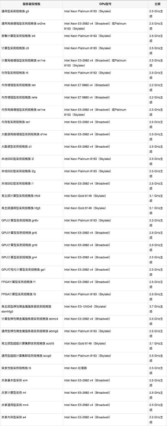 阿里云服務器使用的cpu比較廣泛,服務器規格不同使用的處理CPU型號也不同 ,下面為大家整理了不同規格的ECS云服務器所對應的CPU型號: