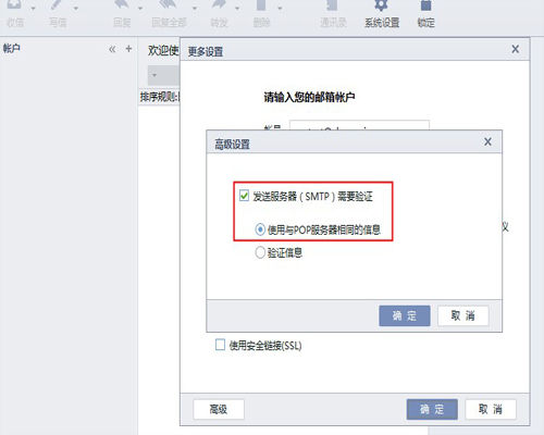 4、在上圖所示界面中,單擊 高級 按鈕,確認 發送服務器(smtp)需要驗證 已經勾選,單擊確定按鈕保存所有設置 。