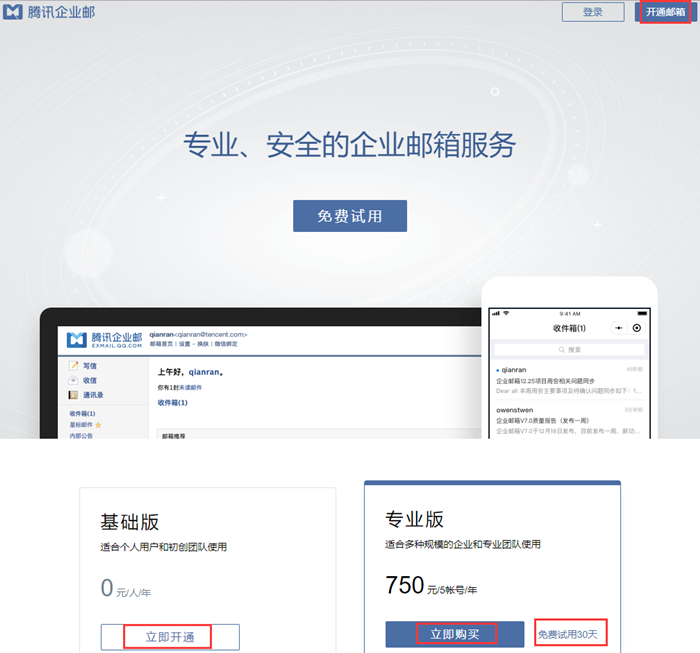 請(qǐng)前往官網(wǎng)exmail.qq.com,點(diǎn)擊【基礎(chǔ)版】/【免費(fèi)試用30天】/【專(zhuān)業(yè)版】–【立即開(kāi)通/購(gòu)買(mǎi)】或者【開(kāi)通郵箱】–【基礎(chǔ)版】–【立即開(kāi)通/購(gòu)買(mǎi)】