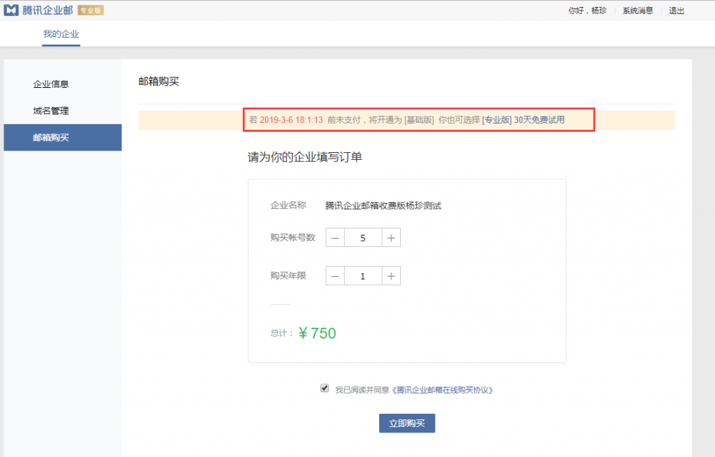 注冊(cè)成功后,進(jìn)入管理后臺(tái),在我的企業(yè)–郵箱購(gòu)買(mǎi),填寫(xiě)需要購(gòu)買(mǎi)的帳號(hào)數(shù)和購(gòu)買(mǎi)年限,提交訂單并支付成功即可獲取專(zhuān)業(yè)版郵箱。