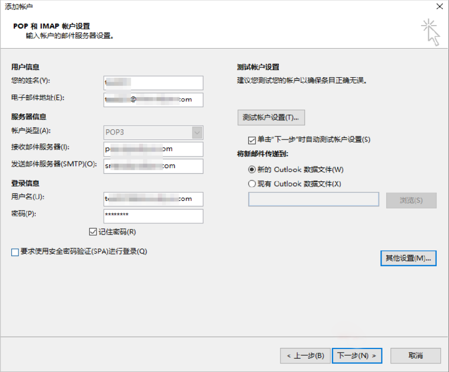 5. 填寫用戶信息服務器信息登錄信息,填寫完成后單擊其他設置。下圖以填寫POP3協議為例。