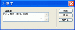 插入關(guān)鍵字,關(guān)鍵字用來協(xié)助網(wǎng)絡(luò)上的搜索引擎尋找網(wǎng)頁。要想讓更多的人看見你的網(wǎng)站,這項要好好填哦^_^單擊上圖所示的“關(guān)鍵字”項,彈出“關(guān)鍵字”對話框,填入關(guān)鍵字即可。