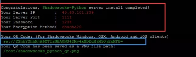 保存好上圖紅框中的內容,這4個信息就是咱們的ss客戶端賬號信息,也可復制藍框中的信息,經過從剪貼板復制添加。至此,云服務器上的SS已經安裝成功,并設置了開機自啟,就算云服務器重啟的話,也無需手動啟動SS。