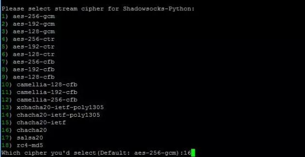 回車后看到加密方式的選擇,選擇chacha20,即序號16,咱們輸入16,而后按回車