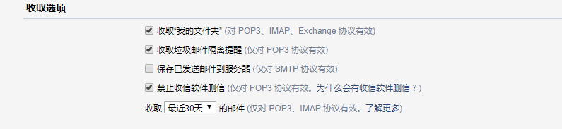 收取【全部】/【最近30天】的郵件:該選項,可設置客戶端收取的郵件范圍,選項僅對POP3、IMAP生效,Exchange協議由客戶端決定收取范圍。