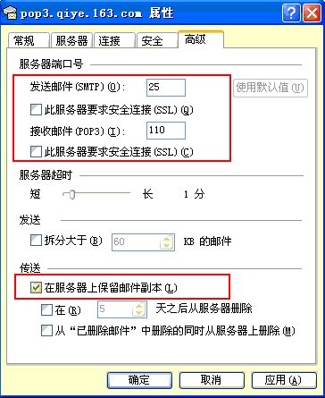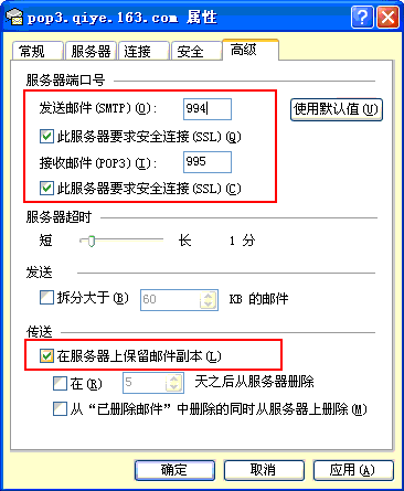 如果您的郵件收發需要采用SSL加密,點擊“高級”,請選擇“此服務器要求安全連接SSL”,SMTP端口參數設置為:994, POP3端口參數設置為:995,如果使用IMAP協議,參數設置為:993請注意,您需要在“傳送”選項勾選“在服務器上保留郵件副本”,以保證所有郵件不會因為使用客戶端收取后而從服務器上刪除。