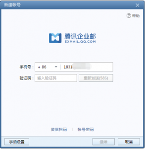 打開foxmail,點擊“新建賬號”–選擇“騰訊企業郵箱”后在掃碼頁面選擇“手機驗證碼”,輸入手機號和正確驗證碼即可配置成功。