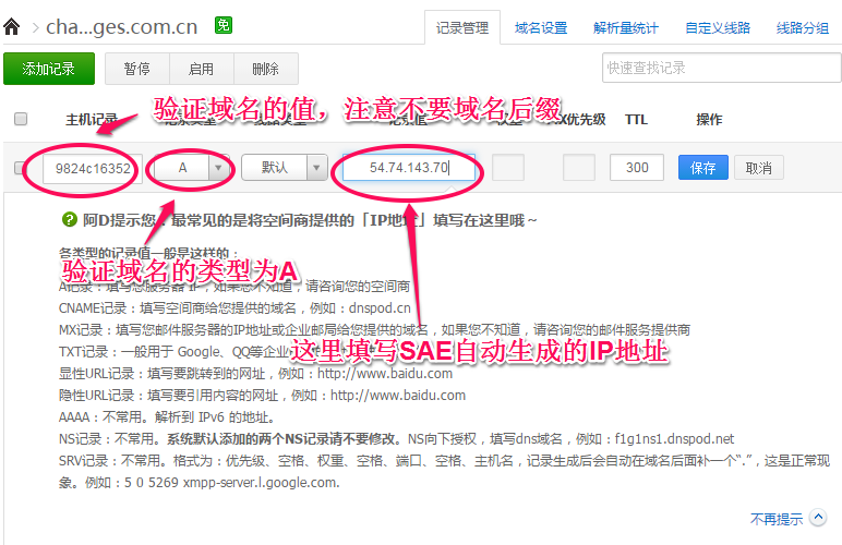 4、以dnspod為例,填寫一下信息,首先添加CNAME的記錄,如圖: