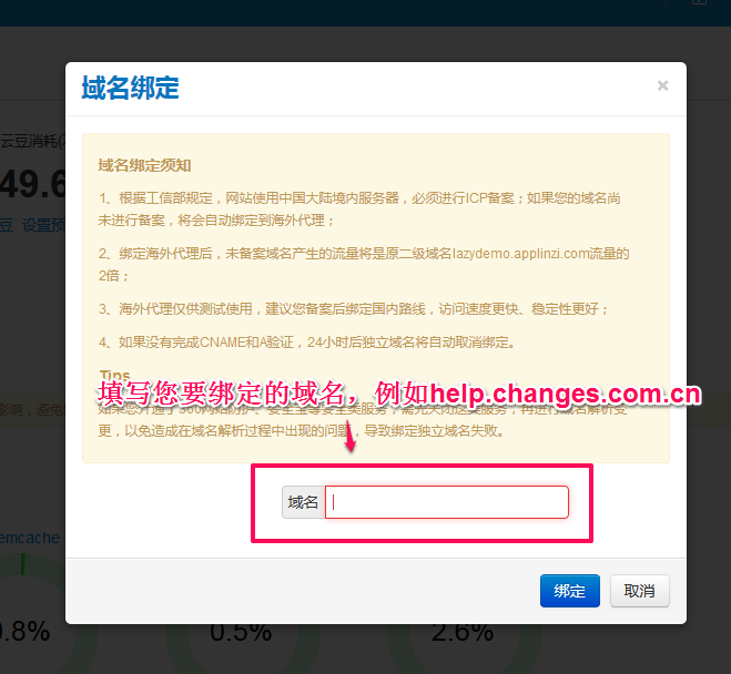 2、點擊“綁定”,輸入您要綁定的獨立域名。