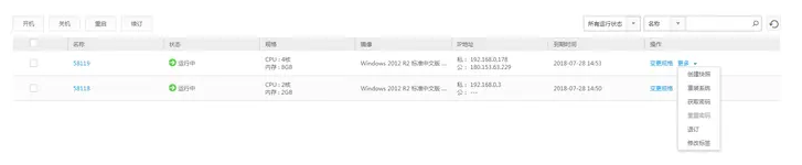 5、看到了云機的具體物理屬性信息了,現在我們來登錄云機。上圖中58119號計算機有一個公共IP地址,那么為了簡便我們就登錄它了。點擊58119計算機后面的“更多”,會彈出復選框: