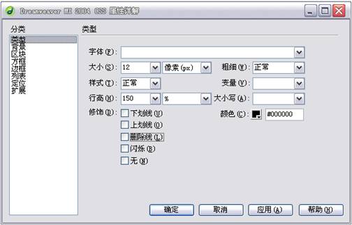 創建CSS樣式表的過程,就是對各種CSS屬性的設置過程,所以了解和掌握屬性設置非常重要。在DW MX 2004的CSS樣式里包含了W3C規范定義的所有CSS1的屬性,把這些屬性分為:類型、背景、區塊、方框、邊框、列表、定位、擴展等八個部分,如下圖: