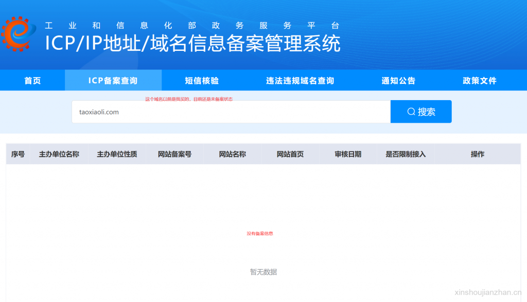 所有備案的域名都是需要通過工信部審核,錄入到系統才可正式使用,所以我們只需要通過工信部的網站查詢域名是否由備案信息就可以辨別出此域名是否有備案了。