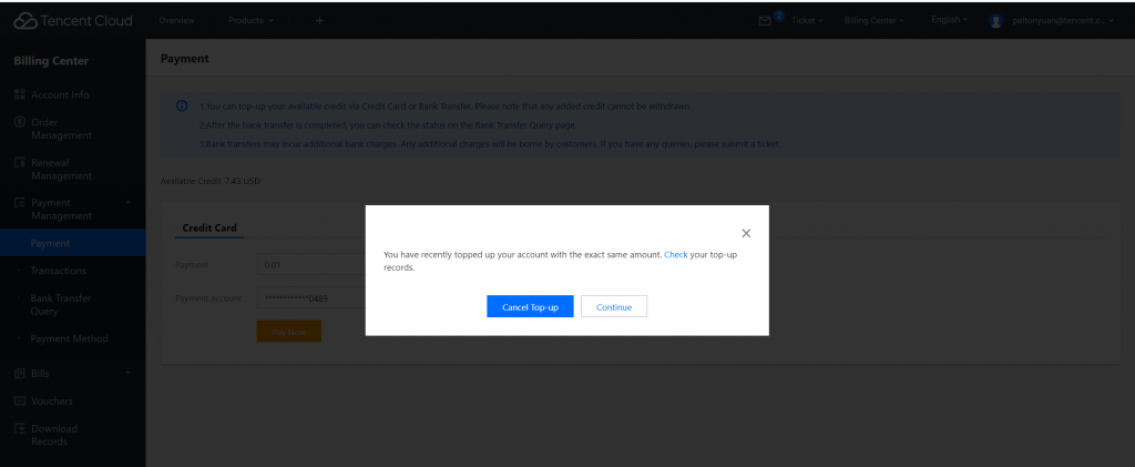 - 登錄騰訊云官網(wǎng)費(fèi)用中心?>?資金管理?>?付款,單擊信用卡輸入充值金額,付款賬號(hào)點(diǎn)擊立即付款。