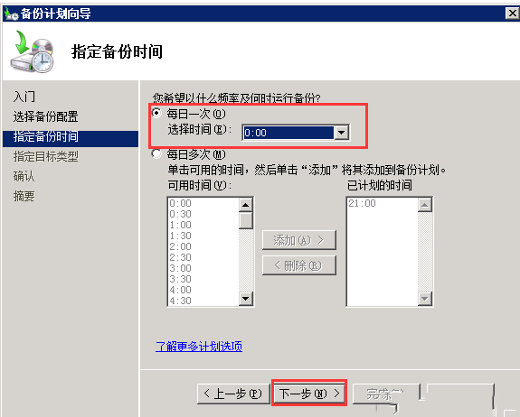 3.由于是全量備份,因此備份不需要過(guò)于頻繁,這里定為一天一次,勾選每日一次,選擇時(shí)間為零點(diǎn),點(diǎn)擊下一步。