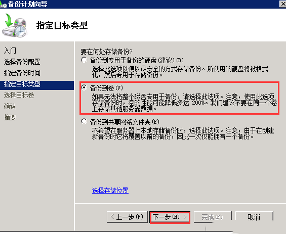 4.由于當(dāng)前服務(wù)器沒(méi)有外接的NAS以及共享文件服務(wù)器,因此只能選擇卷,點(diǎn)擊下一步。