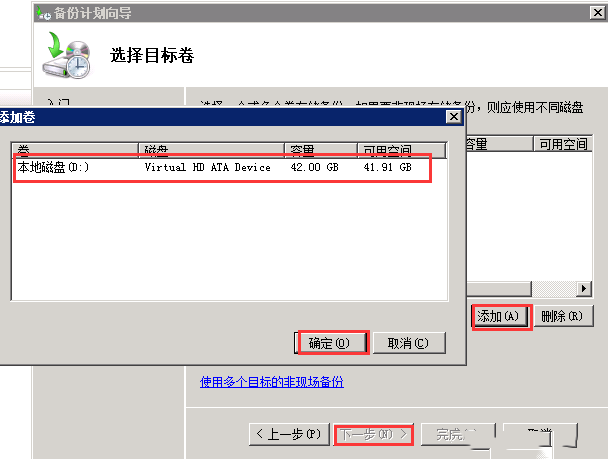 5.點(diǎn)擊添加,選擇備份保存的磁盤,點(diǎn)擊確定,然后點(diǎn)擊下一步。