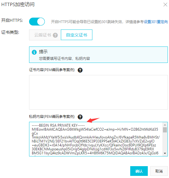 在阿里云虛擬主機面板的 HTTPS 配置界面,找到【私鑰內容】的輸入框。將剛才用記事本打開的 key 私鑰文件中的內容,全部復制粘貼到這個輸入框中。確保內容完整,沒有遺漏或多余的字符。(配圖:key 私鑰文件內容及私鑰輸入框界面)