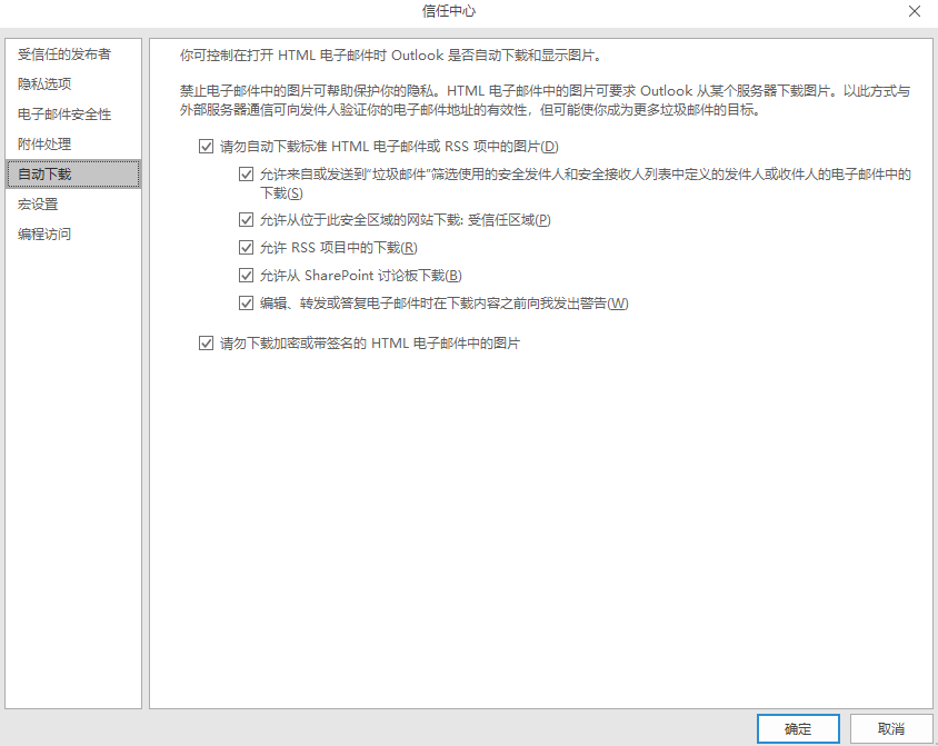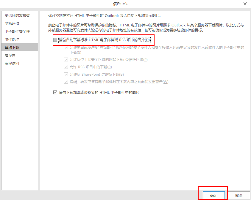 - 在“自動下載”頁面,取消勾選“請勿自動下載標準HTML電子郵件或RSS項中的圖片”,單擊“確定”。