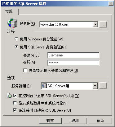 • 此時會出現(xiàn)SQL Server屬性窗口,在“服務(wù)器”中填入您網(wǎng)站的域名,選擇“使用SQL Server身份驗(yàn)證”,“登錄名”和“密碼”分別填入主機(jī)開通郵件中的用戶名和密碼,然后點(diǎn)擊“確定”。